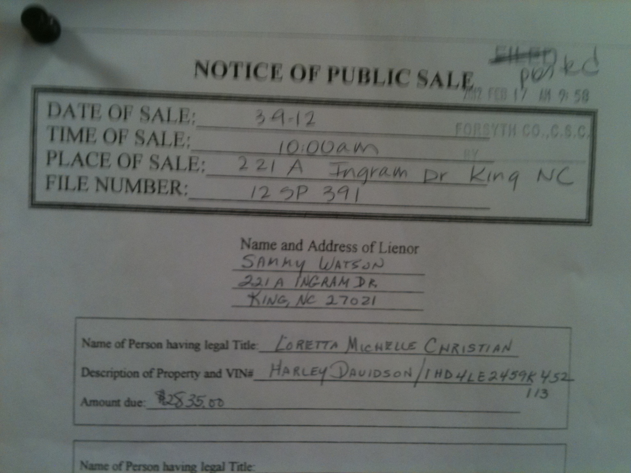Lienholder Sammy Watson of 221-A Ingram Dr. in King NC is selling a Harley Davidson to cover a $2835.00 mechanics lien.