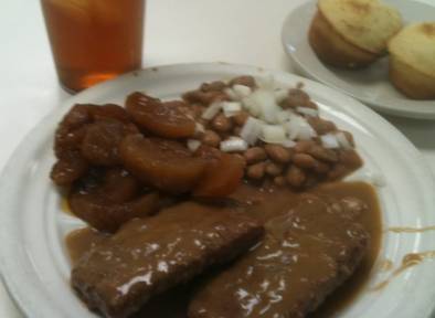 I ordered from the buffet. Choice of meat loaf, country style steak, and tenderloin. I chose the country style steak with fried apples & pintos covered with spoonful of onions–I have a deposition after lunch (sinister laugh). Comes with choice of breads AND drink for $6.49.