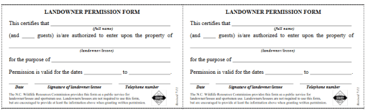 NC Wildlife provides a pdf form that you can use to give permission for hunters to hunt your land. Temporary Hunting Lease. I received one the other day for opening day dove hunt. Worked like a charm for me and the farmer. Thank you farmers of North Carolina. This is not the form to use for a long term or exclusive hunting lease.