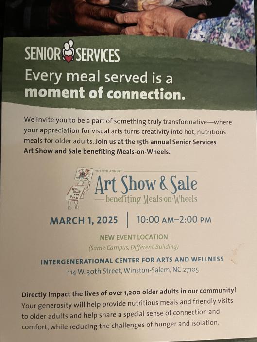 Senior Services Art Show & Sale March 1, 2025 18 Tuesday Feb 2025 Posted by TriadLawyer in Uncategorized ≈ Leave a comment Get there early. Usually a line Share this: Click to share on X (Opens in new window) X Click to share on Facebook (Opens in new window) Facebook Like Loading... Related